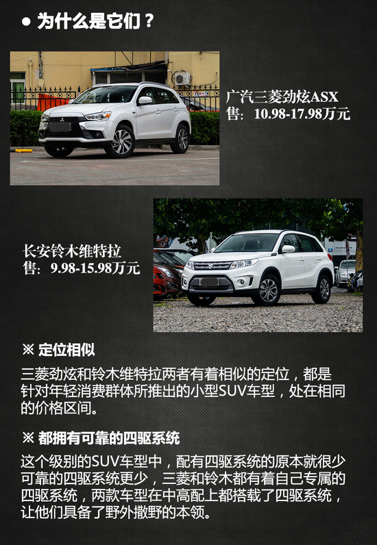 就像我文章開篇提到的,在中國汽車市場中,導致SUV車型火爆的最根本因素其實是它的空間表現和裝載能力,很多人卻忽視了它的越野性能,許多品牌迎合潮流打造了出了僅有SUV外觀卻沒有SUV本質的車型,這些偽SUV無法滿足消費者偶爾撒野的需求,偽SUV普遍存在于緊湊級和小型SUV中,由于受到成本限制,該級別的車型大多數都只有兩驅,因此配有四驅的小型SUV顯得尤為稀罕,而三菱勁炫和鈴木維特拉就成為了少數可選的配置可靠四驅系統的小型SUV車型。
