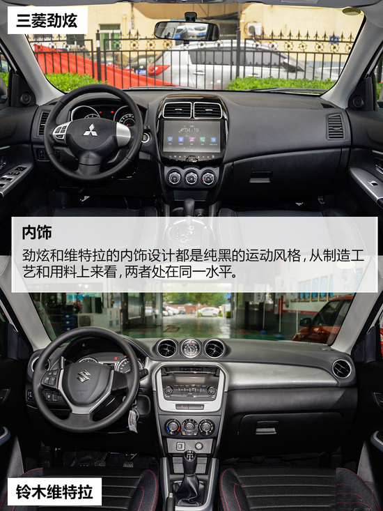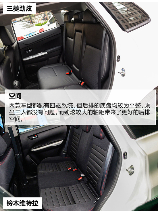 兩者的外觀都有著能吸引年輕消費者眼球的資本,但兩者又分別有著自己的風格,勁炫偏向時尚動感,維特拉偏向硬派作風,其實這兩種不同的風格也代表了兩個品牌的設計取向,就想三菱能夠將歐藍德那樣大尺寸的SUV設計出靈巧動感的視覺感一樣,勁炫也是出于這樣的設計風潮之下,相同的,我們從鈴木的吉姆尼那樣的小車身上仍舊能看到剛勁有力的一面,那么維特拉自然也傳承了這樣的衣缽。從車身尺寸來看,三菱勁炫有著準緊湊級的車身尺寸,而維特拉要偏小一些,不過我認為車身尺寸對于選擇這兩者的消費者來說應該不會太過于重要,畢竟該級別車型還是以年輕人單人或者雙人駕駛為主。