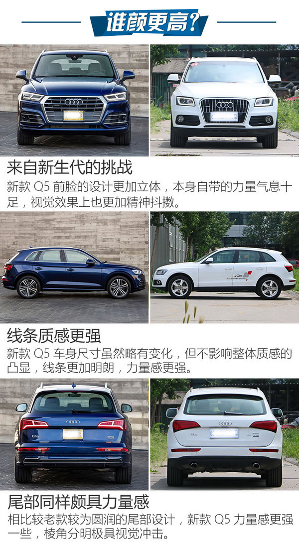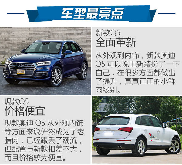 總結:年輕人總是喜歡追逐更美、更時尚的東西,新款Q5也絕對能夠滿足你的這些虛榮心,因為它確實夠靚,但不要認為它只是花架子,在內飾設計、科技配置、動力總成與底盤懸掛等方面,新款Q5絕對做出了等同價位該有的水平。然而現款Q5雖然外觀內飾的設計比較老套,缺乏時尚元素與美感,但好在配置與新款相差不大,并且店內優惠力度較高,從經濟實惠的方向出發肯定選擇現款Q5更為適合。