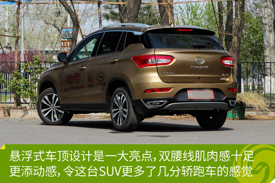 車側(cè)的雙腰線設(shè)計(jì)值得欣賞,肌肉感、力量感讓這臺(tái)SUV看上去更加敦實(shí),同時(shí)也更多了幾分轎跑車的感覺(jué)。而整車最亮點(diǎn)的設(shè)計(jì),莫過(guò)尾部的懸浮式車頂設(shè)計(jì),隱藏在內(nèi)部的Trumpchi標(biāo)識(shí)也有低調(diào)。