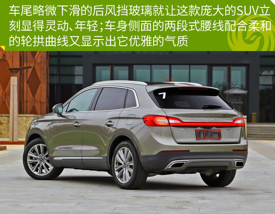 雖然MKX給人總體的印象是威武霸氣,但它也融入了一些當(dāng)前人們喜愛(ài)的流行元素,比如車(chē)尾略微下滑的后風(fēng)擋玻璃就讓這款龐大的SUV立刻顯得靈動(dòng)、年輕;車(chē)身側(cè)面的兩段式腰線配合柔和的輪拱曲線又顯示出它優(yōu)雅的氣質(zhì),總之這款車(chē)并不會(huì)因?yàn)槠浣Y(jié)實(shí)的身板讓人生畏,即便是嬌小女性駕駛也毫無(wú)違和感。