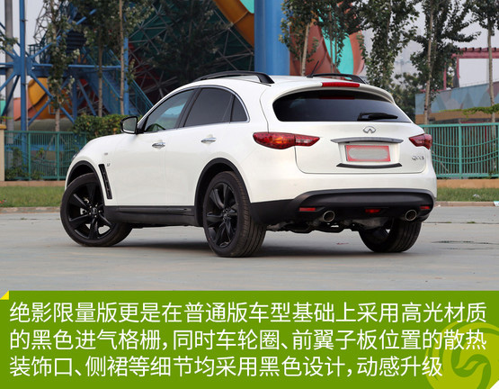 在去年成都車(chē)展上,英菲尼迪QX70絕影限量版正式推出,新車(chē)在普通版車(chē)型基礎(chǔ)上采用高光材質(zhì)的黑色進(jìn)氣格柵,同時(shí)配備帶自動(dòng)水平調(diào)節(jié)的前大燈。此外該車(chē)輪圈、前翼子板位置的散熱裝飾口、側(cè)裙等細(xì)節(jié)均采用黑色設(shè)計(jì),動(dòng)感升級(jí)。