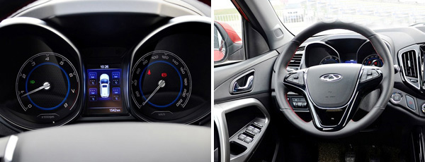 內飾整體設計感強,紅色縫線充滿了年輕動感的氣息,用料雖然不算高檔但是好在做工還不錯。三輻式方向盤帶有打孔皮質包裹和銀色裝飾條,與整體的內飾氛圍比較搭;炮筒式儀表設計感強,只是水溫表和油量表指針設計太過顯眼,儀表板中間的液晶屏負責顯示行車電腦和多媒體信息。