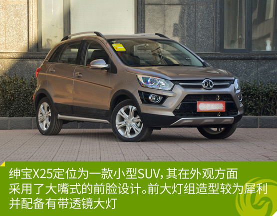 紳寶X25定位為一款小型SUV,其在外觀方面采用了大嘴式的前臉設計。前大燈組造型較為犀利,并配備有帶透鏡大燈。此外,新車下進氣格柵造型夸張,并且新車還配備了黑色的四輪輪眉以及側裙,營造越野風格。