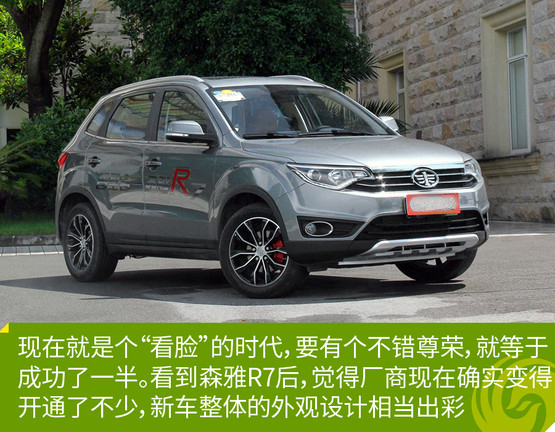 外觀方面,森雅R7采用德國大眾控股汽車設計公司IDG擔當外觀設計,前臉采用全新飛翼式大氣前格柵,加以鍍鉻裝飾點綴,越野范兒十足。此外,鷹眼和鷹嘴造型的頭燈和尾燈,通過車身側面的銳利腰線相互連接,為整車營造出動感的視覺效果。車身側面采用貫穿式高腰線和大輪拱線設計思路,配合17寸炫酷造型的鋁車輪轂。車身尾部采用運動型擾流板、銀色鍍鉻飾板等元素,與前臉形成呼應。