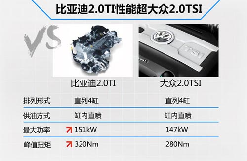 值得一提的是這臺2.0T直噴增壓發動機,在動力數據上不僅全面超越同級對手,甚至趕超大眾集團所生產同排量引擎。據了解,大眾集團所研發的EA888系列2.0T發動機,最大功率為147KW,最大扭矩為280N·m。而比亞迪2.0TI直噴發動機最大功率為151kW,峰值扭矩達320Nm。