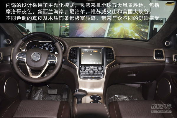 內飾的設計采用了主題化模式,靈感來自全球五大風景勝地,包括摩洛哥夜色,新西蘭海岸,尼泊爾,維蘇威火山和美國大峽谷。不同色調的真皮及木質飾條都極富質感,帶來與眾不同的舒適感受。儀表盤中央提供了一塊7英寸TFT顯示屏,不僅可以用顯示模擬儀表,更有專為越野提供的車輪位置以及傳動顯示。三幅方向盤依然是越野車風格,粗壯而沉穩。而實木與真皮混搭完美詮釋著豪華,運動化的換擋撥片的加入,提升了駕駛樂趣及便捷性。