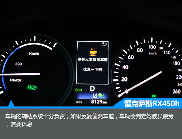 最后,這臺(tái)RX450h還配備了大量輔助駕駛裝備,為的就是享受舒適的駕駛感覺。具體來說,車輛不僅配備了電子“手剎”與自動(dòng)駐車功能,同時(shí)還配備了包括BSM盲區(qū)監(jiān)測(cè)、LDA車道保持、ACC自適應(yīng)雷達(dá)、預(yù)碰撞報(bào)警以及駕駛員疲勞檢測(cè)。開啟這些設(shè)備后,車輛會(huì)處于一種半自動(dòng)的駕駛狀態(tài),而在壓線的時(shí)候,方向盤不僅會(huì)有震動(dòng),同時(shí)也會(huì)微調(diào)以保持車輛處在車道中間。有一個(gè)有趣的現(xiàn)象,當(dāng)電腦反復(fù)偵測(cè)到壓線并且做出微調(diào)后,會(huì)判斷駕駛員處于疲勞的狀態(tài),提醒注意休息。總的來說,雷克薩斯RX450h是一臺(tái)非常適合享受旅行、細(xì)細(xì)品味生活的一臺(tái)車。