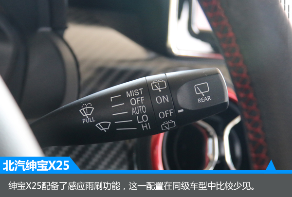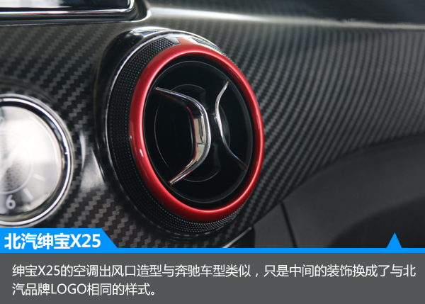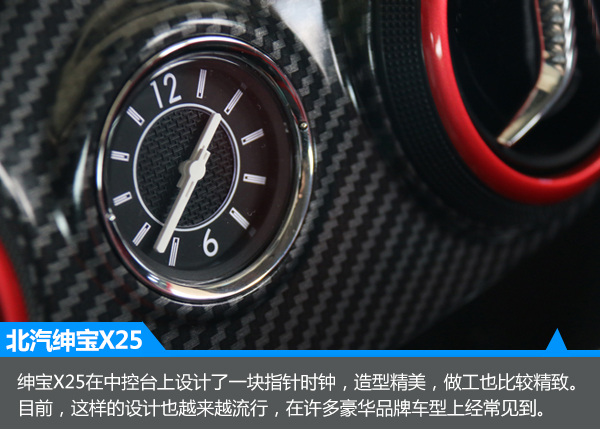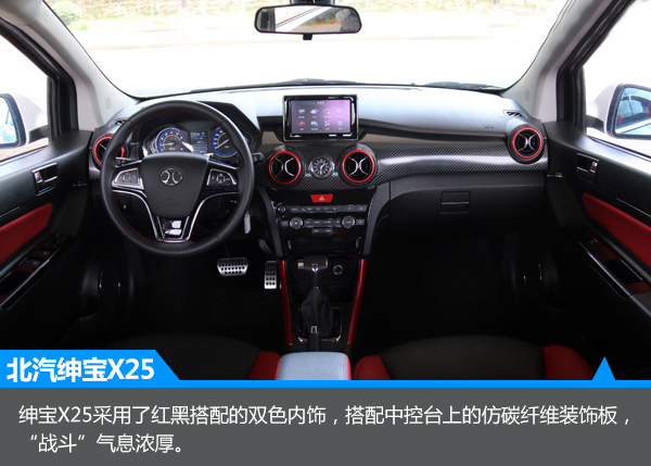 作為一款主打年輕時尚的小型SUV,紳寶X25在內飾設計上同樣緊隨潮流,采用了紅黑搭配的雙色配色。同時,中控臺上還采用了大面積仿碳纖維裝飾面板,為座艙營造出一定的“戰斗”氣息。而且,整個中控臺造型與奔馳家族的車型有幾分相似,有著不錯的視覺效果。此外,在內飾用料方面,出于成本控制,紳寶X25的整個內飾用了大面積的硬質塑料,當然,同級車型也都是如此。雖然用料沒那么昂貴,但紳寶X25內飾細節的處理還比較到位,各部分組件間的間隙很均勻,值得稱贊。