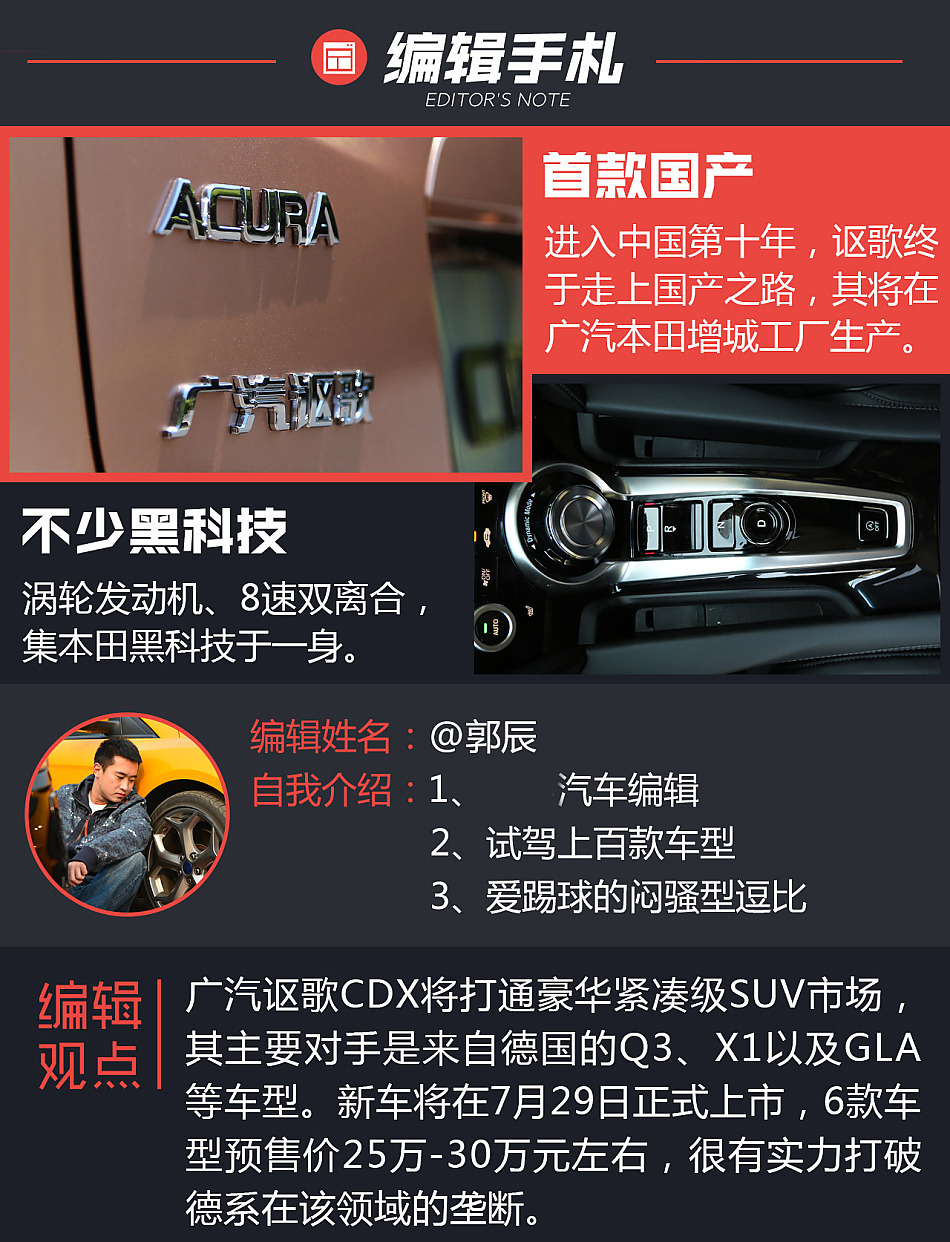 【SUV中國網(wǎng)】今天我們要說的是一款全新的豪華緊湊型SUV,它就是廣汽謳歌CDX。沒錯,名字的前綴加上了廣汽,在謳歌進入中國的第十個年頭,我們終于迎來了它旗下的首款國產(chǎn)車型。而它也肩負重任,不僅是提升謳歌品牌的形象大使,更是要打破Q3、X1、GLA等德系品牌在該級別中的壟斷地位。