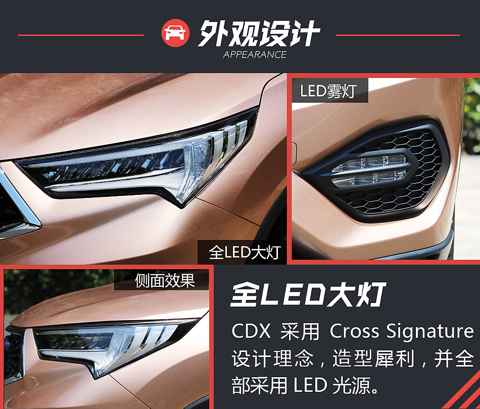 廣汽謳歌CDX采用了謳歌全新的“Alluring Modern Edge”設(shè)計理念,其中不少元素都和此前在北美車展亮相的PRECISION概念車相似。設(shè)計風(fēng)格比較前衛(wèi)、極致,符合其面對年輕精英消費群體的市場定位。