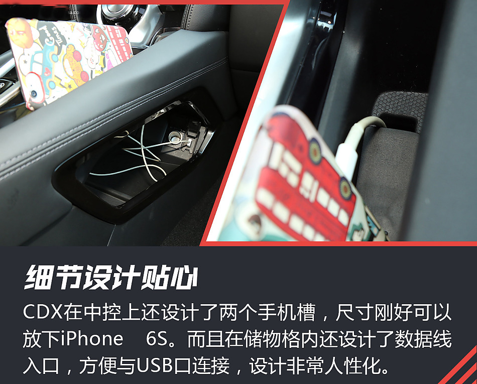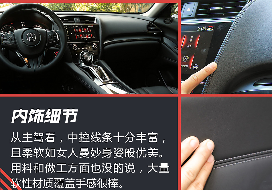 CDX采用環(huán)抱式內(nèi)飾設(shè)計,視覺效果不錯,尤其是中控部分的設(shè)計,很有美感。在用料和做工方面處理也很妥當(dāng),大量軟性材質(zhì)覆蓋并采用了縫線處理,挺有豪華感同時不會顯得浮夸。