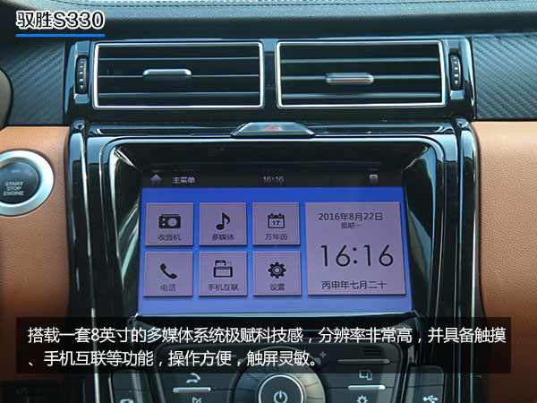 搭載一套8英寸的多媒體系統極賦科技感,分辨率非常高,并具備觸摸、手機互聯等功能,操作方便,觸屏靈敏。