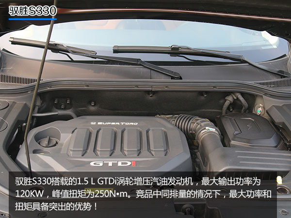 馭勝S330搭載的1.5 L GTDi渦輪增壓汽油發動機,最大輸出功率為120KW,峰值扭矩為250N·m。競品中同排量的情況下,最大功率和扭矩具備突出的優勢!
