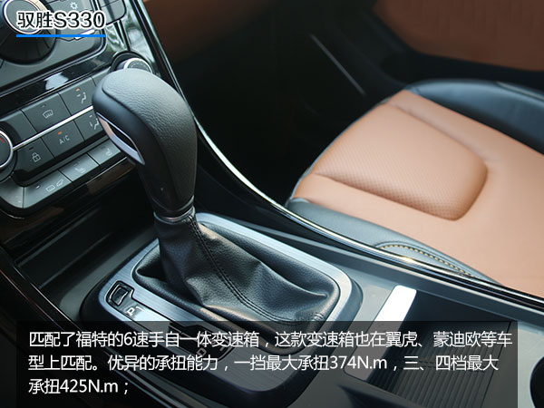 匹配了福特的6速手自一體變速箱,這款變速箱也在翼虎、蒙迪歐等車型上匹配。優異的承扭能力,一擋最大承扭374N.m,三、四檔最大承扭425N.m;