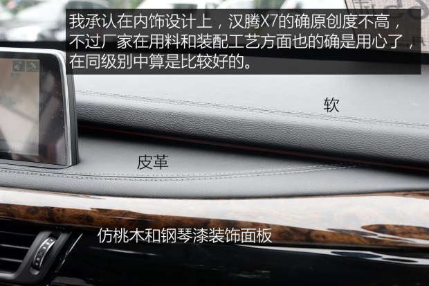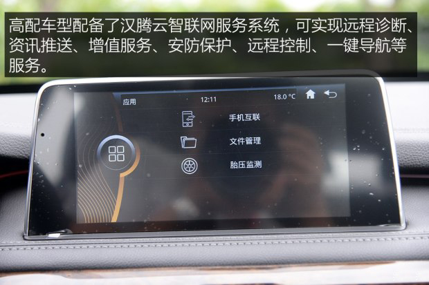 內(nèi)飾部分,漢騰X7使用多種材質(zhì)搭配,整體布局借鑒了寶馬的設(shè)計(jì)。配置方面,漢騰X7搭載9寸多點(diǎn)觸控電容屏,配合漢騰云智聯(lián)網(wǎng)服務(wù)系統(tǒng),可實(shí)現(xiàn)遠(yuǎn)程診斷、資訊推送、增值服務(wù)、安防保護(hù)、遠(yuǎn)程控制、一鍵導(dǎo)航等服務(wù)。此外該車還配備了電動(dòng)尾門、220V電源及USB插口、無鑰匙進(jìn)入及一鍵啟動(dòng)系統(tǒng)。值得一提的是,漢騰X7還配備有全彩多信息顯示HUD抬頭顯示系統(tǒng)。
