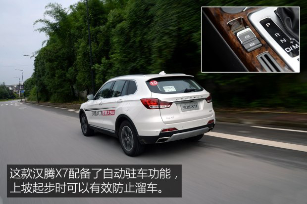 在道路試駕過程中有一小段山路,因?yàn)橛泻芏嗌鐣?huì)車輛,秉著安全的原則,所以車隊(duì)的整體速度并不快。在這過程中,我還是嘗試著將變速箱切換到了手動(dòng)模式。其實(shí)一般的家用雙離合變速箱換擋速度并不快,而且在靜止上坡的一瞬間,還容易出現(xiàn)短暫溜車的現(xiàn)象,好在這款漢騰X7配備了自動(dòng)駐車功能,在右腳離開剎車踏板的時(shí)候,可以有效防止溜車,這個(gè)功能對于生活在非平原地區(qū)的車主來說,非常實(shí)用。