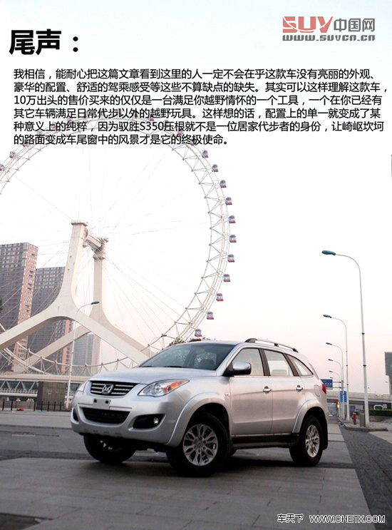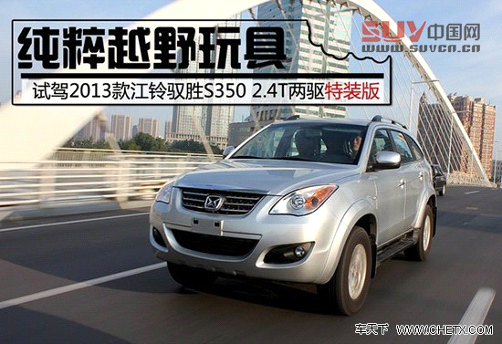 還真有!來自江鈴的馭勝(報價 參數(shù) 圖片 論壇)S350也許并沒有出現(xiàn)在各大車市的熱門銷量榜,但這臺并不那么鮮為人知的車型卻是一款實(shí)實(shí)在在的硬派越野車。今年6月,江鈴?fù)瞥隽?013款馭勝S350,該車全系共有兩種發(fā)動機(jī)(2.4升渦輪增壓、2.4升自然吸氣),分別擁有兩驅(qū)和四驅(qū)共四款車型,官方將新款車型稱之為“特裝版”。經(jīng)過查看配置表得知,所謂“特裝版”就是去掉所有多余浮華的配置,只對日常駕駛需求有所保留。也就是說,四款車型除了動力排量以及兩輪/四輪驅(qū)動不同外,其它配置,全系均為一個標(biāo)準(zhǔn)。突然覺得這么純粹的車并不需要太多的廢話來鋪墊,來吧,馬上帶你感受那種最原始的硬派越野。