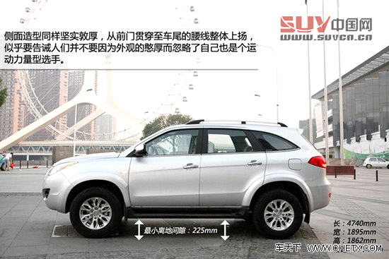 側(cè)面造型同樣堅實(shí)敦厚,從前門貫穿至車尾的腰線整體上揚(yáng),似乎要告誡人們并不要因?yàn)橥庥^的憨厚而忽略了自己也是個運(yùn)動力量型選手。作為一臺硬派越野車,大尺寸的越野輪胎則是必選裝備。馭勝S350特裝版采用了一款來自臺灣的FEDERAL全地形輪胎,尺寸為265/65R17,通過數(shù)據(jù)可以看出這款輪胎的胎寬以及扁平比都是為了越野而打造的。輪轂采用了17寸鏤空樣式,樣式平庸但也還算大氣。全地形輪胎的配備必然是為了可觀的通過性,而225mm的最小離地間隙也同樣是通過性的有力保障。
