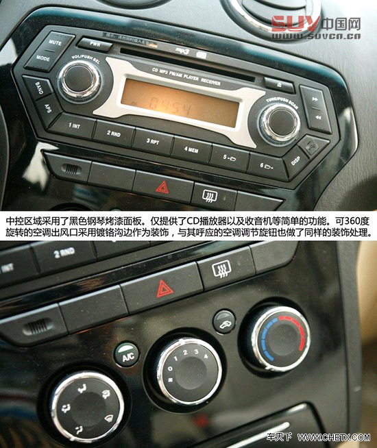 前文提到,特裝版的馭勝S350去掉了所有日常駕駛以外的配置,一切從簡單實(shí)用出發(fā)。被去掉的配置還包括了液晶屏,中控區(qū)域采用了黑色鋼琴烤漆面板。僅提供了CD播放器以及收音機(jī)等簡單的功能。可360度旋轉(zhuǎn)的空調(diào)出風(fēng)口采用鍍鉻溝邊作為裝飾,與其呼應(yīng)的空調(diào)調(diào)節(jié)旋鈕也做了同樣的裝飾處理。所有的按鍵質(zhì)感以及做工都非常不錯,在自主品牌車型里應(yīng)該算得上是上乘檔次了。