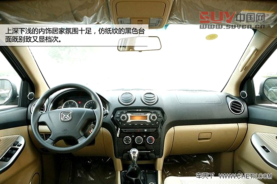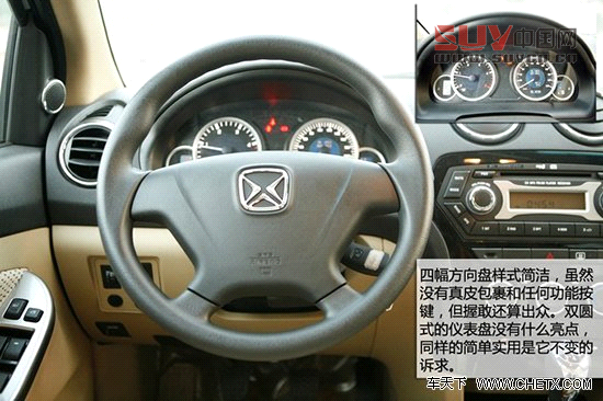 內(nèi)飾做工粗糙是很多自主品牌的詬病,而馭勝S350特裝版的內(nèi)飾做工卻沒有粗制濫造。上深下淺的內(nèi)飾居家氛圍十足,仿紙紋的黑色臺面既別致又顯檔次。四幅方向盤樣式簡潔,雖然沒有真皮包裹和任何功能按鍵,但握敢還算出眾。值得一提的是,馭勝S350特裝版的轉(zhuǎn)向助力非常微弱,無論在駕駛過程中以及原地打輪時都得使點(diǎn)力氣才能完成轉(zhuǎn)向,看來這真是一款為真男人打造的越野車啊。雙圓式的儀表盤沒有什么亮點(diǎn),同樣的簡單實(shí)用是它不變的訴求。位于兩個大圓旁邊的兩個小圓,分別用來顯示水溫和油箱,一目了然。