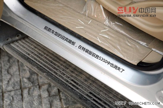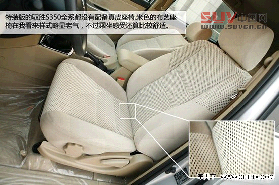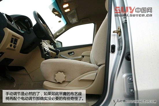 特裝版的馭勝S350全系都沒有配備真皮座椅,就好像前面提到的液晶屏一樣,真正的越野老玩家也許不需要這些上檔次的配置,耐用盡造才是他們所需要的。米色的布藝座椅在我看來樣式略顯老氣,不過乘坐感受還算比較舒適。手動調(diào)節(jié)是必然的了,如果如此平庸的布藝座椅再配個電動調(diào)節(jié)那確實(shí)沒必要的有些奇怪了。前款車型的迎賓踏板,在特裝版馭勝S350中也消失了,還是秉承那個原則:沒用的一律不要。