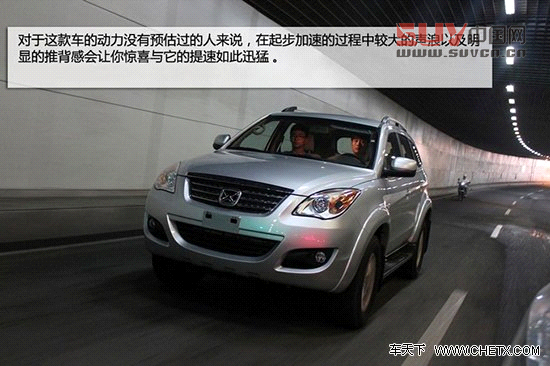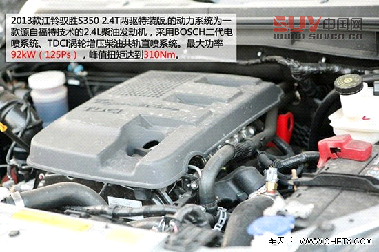 我們本次試駕的車型是2013款江鈴馭勝S3502.4T兩驅(qū)特裝版,它的動力系統(tǒng)為一款源自福特技術(shù)的2.4L柴油發(fā)動機(jī),采用BOSCH二代電噴系統(tǒng)、TDCI渦輪增壓柴油共軌直噴系統(tǒng)。最大功率92kW(125Ps),峰值扭矩達(dá)到310Nm。聲大、動力猛是柴油渦輪增壓發(fā)動機(jī)的共性,這兩個特點(diǎn)在馭勝S350特裝版中也得以體現(xiàn)。與其搭配的是一款5速手動變速箱,并且全系沒有自動擋車型。說到這,我想起了這臺車帶給我的第一個駕駛感受就是離合踏板行程巨長,長的恨不得腳踩到底都沒有觸碰到盡頭。