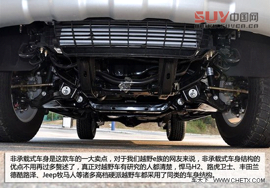 非承載式車身是這款車的一大賣點(diǎn),對于我們越野e族的網(wǎng)友來說,非承載式車身結(jié)構(gòu)的優(yōu)點(diǎn)不用再過多贅述了,真正對越野車有研究的人都清楚,悍馬H2(報價 參數(shù) 圖片 論壇)、路虎衛(wèi)士(報價 參數(shù) 圖片 論壇)、豐田蘭德酷路澤(報價 參數(shù) 圖片 論壇)、Jeep牧馬人(報價 參數(shù) 圖片 論壇)等諸多高檔硬派越野車都采用了同類的車身結(jié)構(gòu)。