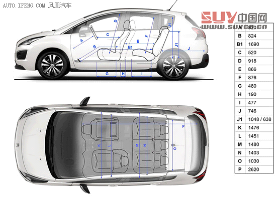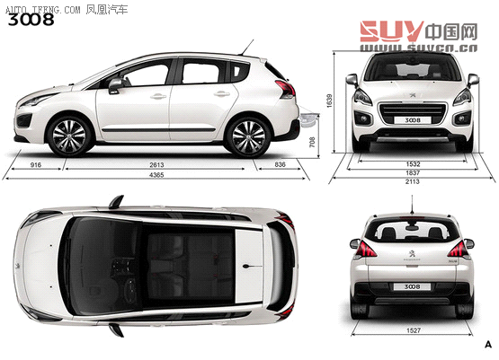 2014款標(biāo)致3008的車身尺寸為長*寬*高:4365*1837*1639mm,與國產(chǎn)現(xiàn)款的4428*1840*1639mm尺寸接近,軸距也同為2613mm,相差之處僅是外觀飾件不同所帶來的微小差異。
