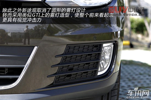 新途觀的外觀給人的感覺更加科技與時尚,但其實改動的地方并不多,主要是車燈方面的變化,加入了淚眼日間行車燈的頭燈使得它開起來更像“大哥”途銳;除此之外新途觀取消了圓形的霧燈設計,轉而采用類似GTI上的霧燈造型,使整個前來看起來更具有視覺沖擊力。