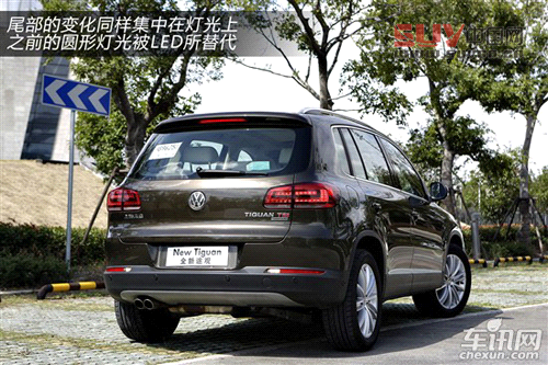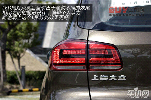 尾部的變化同集中在燈光上,新途觀的尾燈同樣采用了新的設計,之前的圓形尾燈被LED光源所取代,相比之前的設計,編輯個人認為新途觀上這個L形燈光效果更好也更具有科技感。