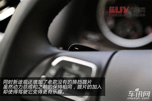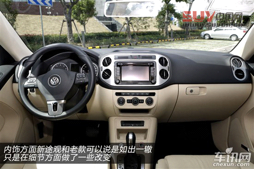 內飾方面新途觀和老款可以說是如出一轍,只是在細節方面做了一些改變。例如空調控制面板改變了布局,操作起來變得更加人性化;儀表盤中央的液晶顯示屏改用彩色顯示;頂配車型上增加了換擋撥片,雖然動力總成和之前的保持相同,撥片的加入卻使得駕駛它變得更有樂趣。
