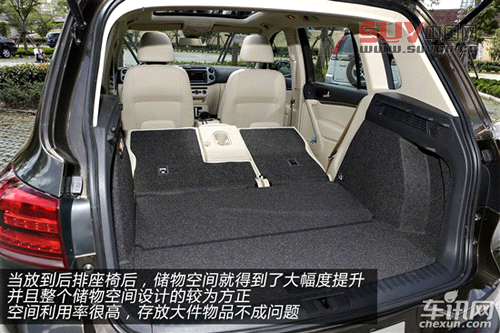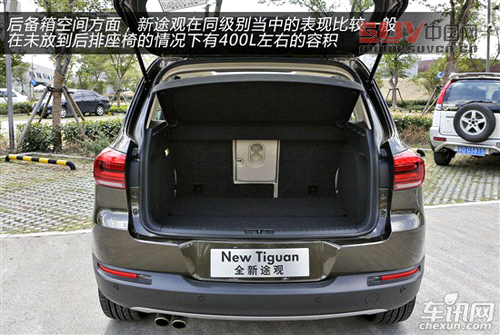 后備箱空間方面,新途觀在同級別當中的表現比較一般,在未放到后排座椅的情況下有400L左右的容積;不過當放到后排座椅后,儲物空間就得到了大幅度的提升,并且整個儲物空間設計的較為方正,空間利用率很高,存放大件物品不成問題。