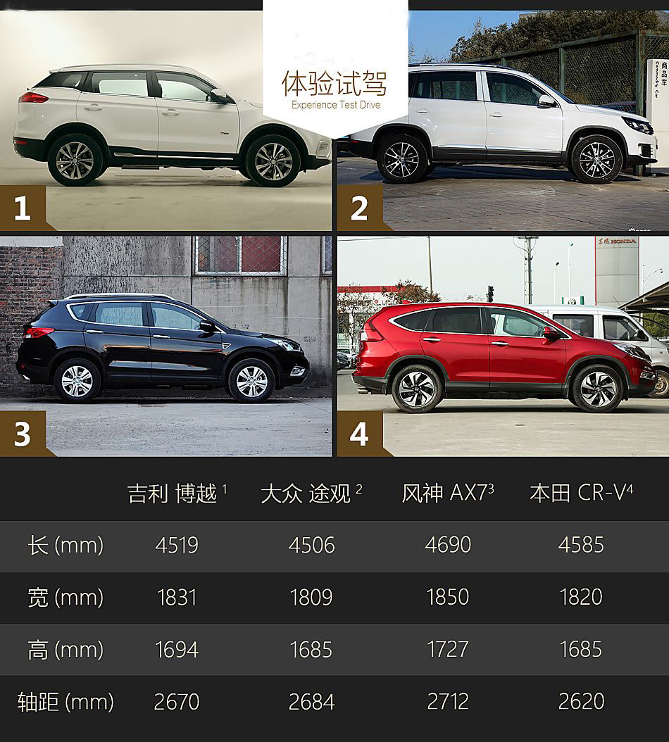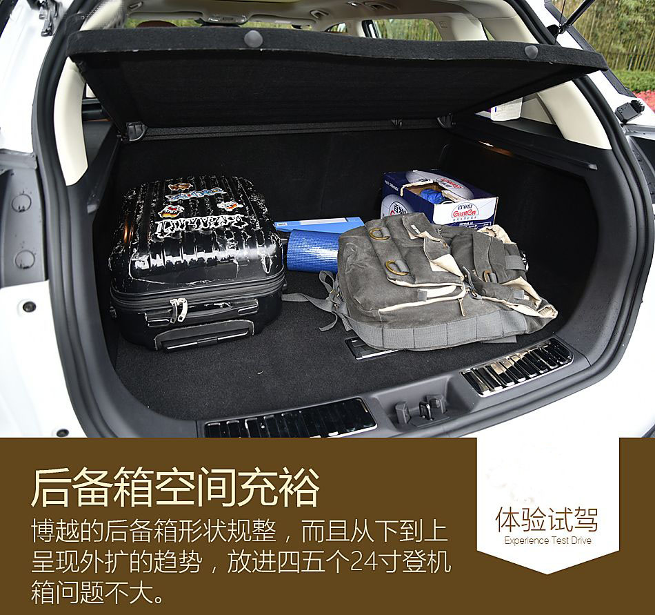 吉利的工作人員告訴我,博越在研發期間的對標車型為大眾途觀。通過對比軸距我們發現,博越的軸距處于緊湊型SUV的中游水準,但一個軸距不能明顯反映出實際的空間,因為實際體驗后我們發現博越的后排腿部空間實際上要比途觀還略強一些。