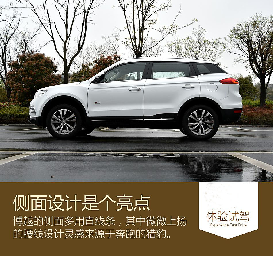 側面是博越外觀的一大亮點,微微上揚的腰線給這款車帶來了一定的俯沖感。