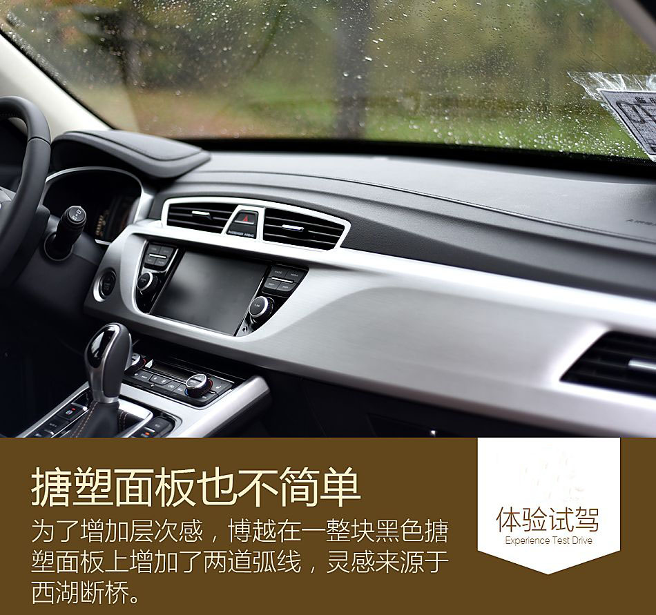 這里需要說明的是,對于面板這種整塊材料,加工時多一道弧線、多一個切面都會導致成本的提升。一般來講我們看到的靠近風擋的內飾面板都是最簡單的平面或弧面,而設計師為了給博越的內飾營造出更多的層次感,給這塊面板增加了兩條舒緩的弧線,確實讓整車的內飾顯得不那么單調了。