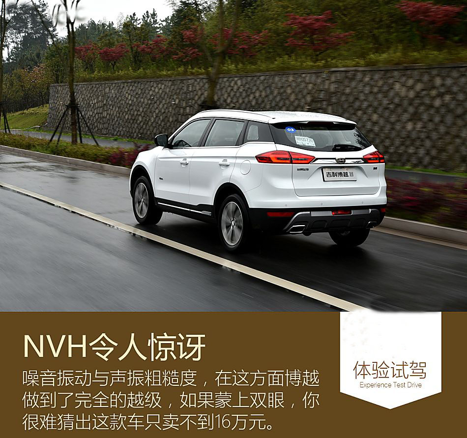博越的NVH表現完全實現了越級,剛才說了底盤的隔音,除了底盤,博越的風噪控制也相當到位,80km/h巡航的狀態下,車內人員幾乎聽不到風噪聲,這是一些轎車都很難實現的,但是博越做到了。而發動機的噪音也是非常收斂,尤其是在高轉高負荷情況下,那種討厭的哀嚎聲并不會出現在博越上面,只是2000-3000rpm時,節氣門完全打開的情況下發動機噪音略微明顯一些。不夸張地講,博越的NVH達到了合資緊湊型SUV中較好的水平。
