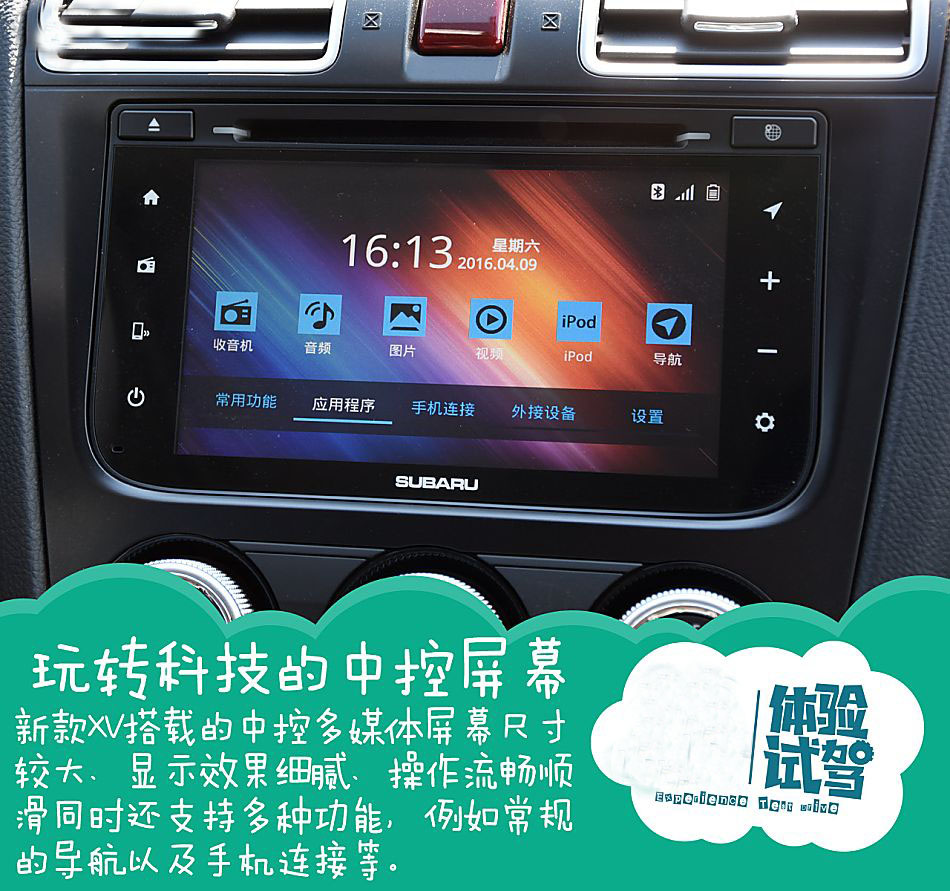 斯巴魯XV的觸控屏只需要手指輕輕一點一點,便可以輕松完成任何操控,整體的流暢順手度很 高。它提供HOME和音頻兩種畫面可以供選擇。整體的界面簡潔,主功能一目了然。同時配備了日常行 車的基本要求,例如,導航以及手機藍牙連接等。