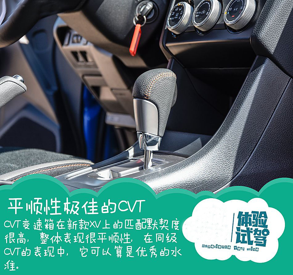 新款XV所搭載的CVT變速箱的表現在同級別日系車中可以排到上乘的水準,整體反應還算迅速 ,不會像某些配置CVT變速箱卻與發動機匹配度不佳的車輛,在提速的過程中讓人有種說不出的“無聊 感”。而它最大的特點還是在于CVT天生的平順性,這可以更好地照顧以舒適為訴求大部分家庭的需要 。而如果您仍然想要速度與激情的話,只需要油門開度大一些,此時變速箱會改變齒比,提高轉速, 帶來更為迅猛的加速體驗。