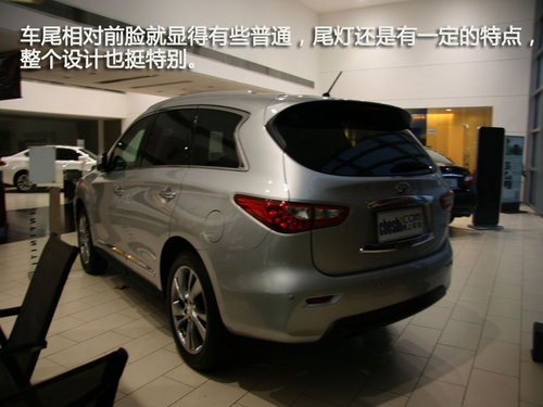 英菲尼迪JX的前臉采用了英菲尼迪最新的家族式設(shè)計,中部的鍍鉻進氣格柵面積很大,寬厚的車頭充滿力量感,與FX系列的前衛(wèi)動感造型截然不同,有些趨向于QX粗獷的風(fēng)格,但JX的曲線與硬朗的QX相比則多出幾分優(yōu)雅。