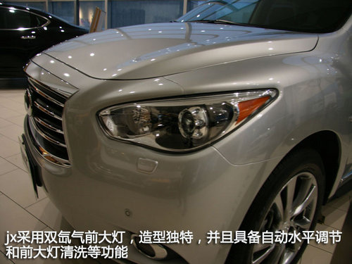 通過jx35前大燈可以感受到j(luò)x的豪華設(shè)計,jx采用雙氙氣前大燈,造型獨特,并且具備自動水平調(diào)節(jié)和前大燈清洗等功能,并且在光線較暗的時候,前大燈能自動點亮,為駕駛安全帶來極大的保障。