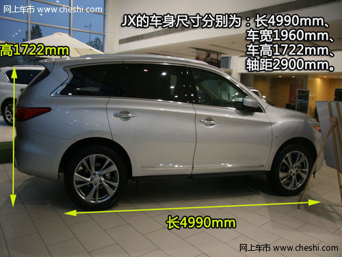 車身尺寸非常闊綽,相比較同為7座SUV的競爭車型XC90,要顯得更加闊綽,這在非常重視車身尺寸的中國市場是非常受歡迎的。JX的車身尺寸分別為:長4990mm、車寬1960mm、車高1722mm、軸距2900mm。英菲尼迪JX的兩驅(qū)車型整備質(zhì)量達到了1956kg,雖然車身龐大,但0.34風(fēng)阻系數(shù)表現(xiàn)出色。
