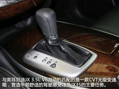 與英菲尼迪JX 3.5L V6發(fā)動機匹配的是一款CVT無級變速箱,營造平順舒適的駕駛感受才是JX35的主要任務(wù)。 英菲尼迪JX35共有四種駕駛模式:標(biāo)準(zhǔn)、經(jīng)濟、運動、雪地。