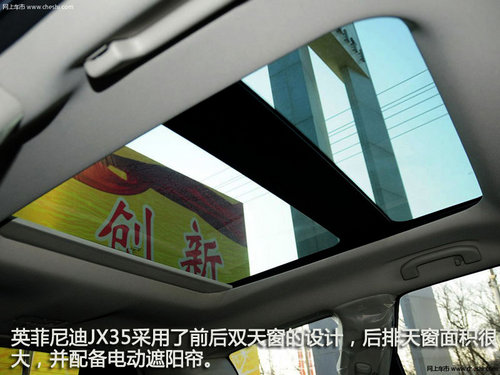 英菲尼迪JX35采用了前后雙天窗的設(shè)計,后排天窗面積很大,并配備電動遮陽簾,可惜只有前排天窗可以打開,后排大面積天窗不能打開。如此大的采光面積為后排乘客提供更愜意的乘坐感受。