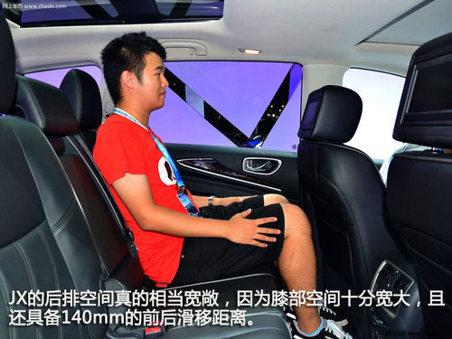 JX的后排空間真的相當(dāng)寬敞,因為膝部空間十分寬大,且還具備140mm的前后滑移距離,如果退到最后方,在第二排翹個二郎腿是沒有問題的,這讓我又聯(lián)想到了英菲尼迪M25L,后排空間同樣舒適豪華。JX的頭部空間充裕,再配上兩段式全景天窗,雖不能開啟或上掀,但透過大面積透明玻璃,還是能在旅途中沐浴到車外的陽光,毫無壓抑感。