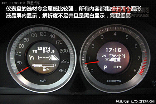 方向盤的手感偏粗壯,能提供比較飽滿的握感,對于身材偏高大的男士來說十分舒服,對于女士來說則要看個人的喜好了。方向盤的樣式比較老了,傳統的四輻設計看起來中規中矩但缺乏時尚感。濃烈金屬質感的儀表盤看起來質感不錯,兩塊圓形液晶屏取代了傳統的油表、擋位顯示等功能,不過這個分辨率的單色液晶屏已經不太如流了。
