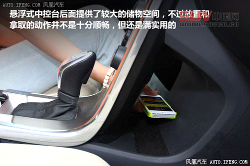 懸浮式中控臺所提供的隱蔽儲物格空間不小,但我們的模特覺得不知該放些什么,手機、錢包這類常用的東西雖然可以輕松的放進去,但拿起來的時候并不是很順手。車內的儲物空間除了懸浮中控臺后方比較特殊外,其他的設計都比較常規,但是空間表現都還不錯。