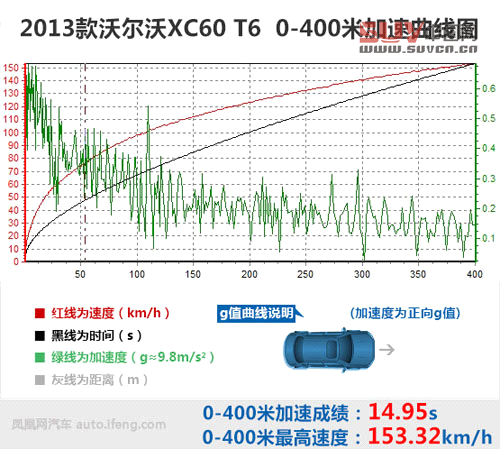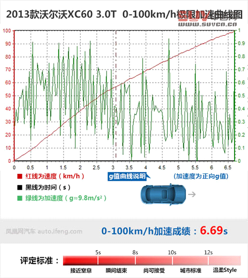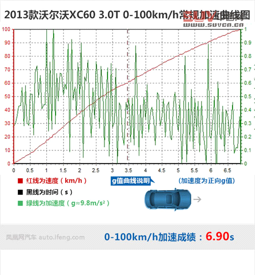 而在常規加速測試中,XC60的成績也穩穩當當的進入了7秒之內,達到6.9秒的成績。這其中與極限加速測試0.21秒的成績差異來自于起步,當松開剎車的一瞬間,車輛就開始向前移動,此時測試設備開始計時,簡單的說就相當于還未做好起跑準備。而后面的加速曲線和G值與極限測試并沒有什么區別,依舊有著強大的加速力。