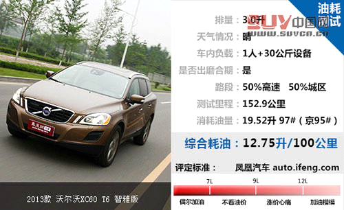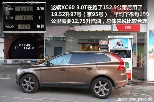 1.9噸車重加上3.0L的渦輪增壓發動機,我們在測試前就肯定這輛車最終的油耗不會給人太大驚喜。這輛XC60 3.0T在跑了152.9公里后用了19.52升97號(京95號),平均下來每100公里需要12.75升汽油,這個油耗包含一半市區高峰和一半通暢的高速公路,總體來說比較合理,不算很省但也不算太費油,畢竟買XC60的T6版本的消費者更看重T6發動機的動力表現。