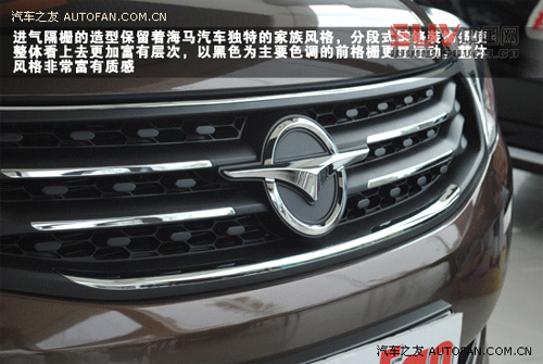 進(jìn)氣隔柵的造型保留著海馬汽車獨(dú)特的家族風(fēng)格,分段式鍍鉻裝飾條使整體看上去更加富有層次,以黑色為主要色調(diào)的前格柵更顯運(yùn)動,整體風(fēng)格非常富有質(zhì)感。